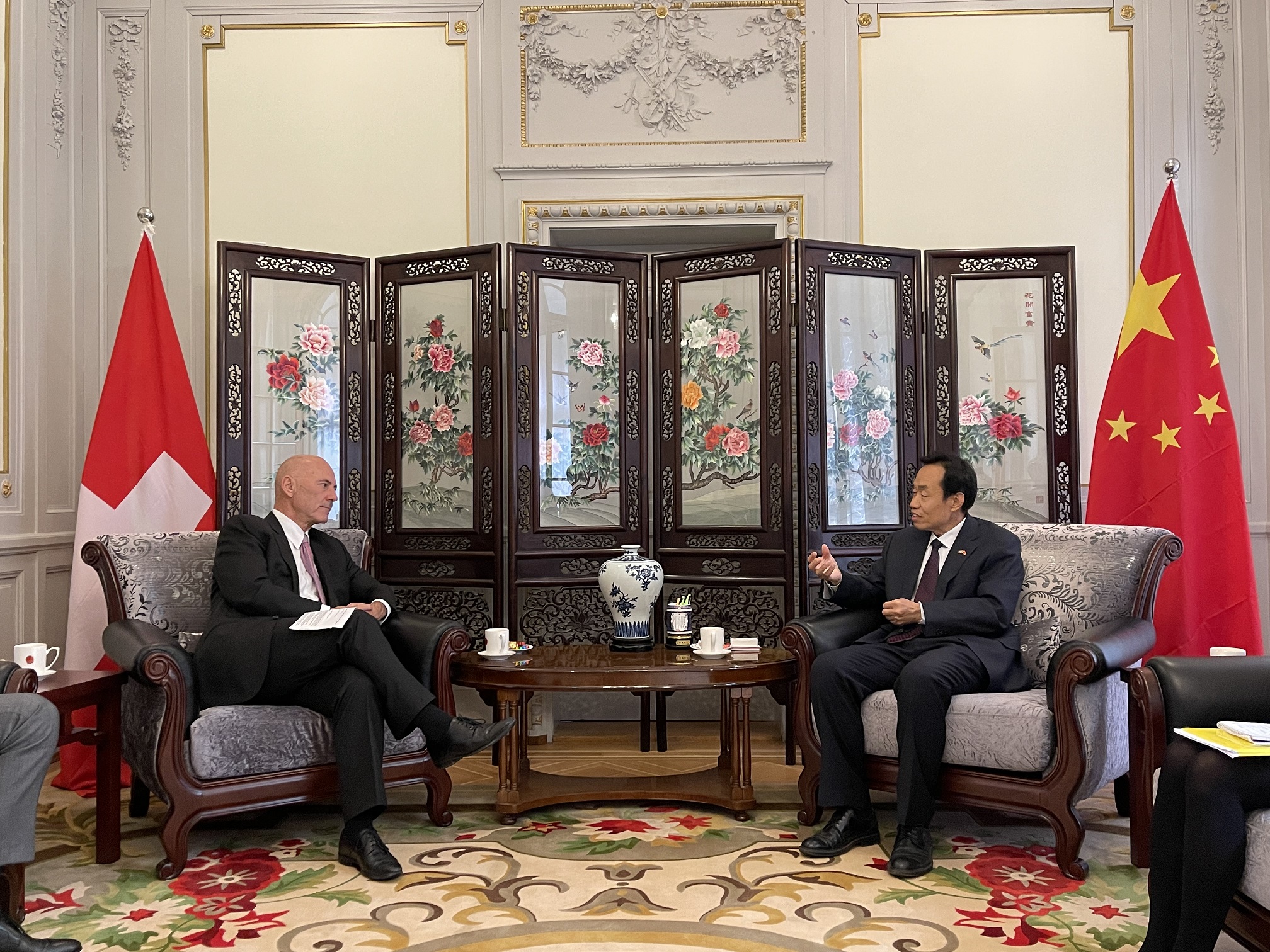 9月27日,驻瑞士大使王世廷在使馆会见瑞士联邦财政部国际金融事务国秘处副国秘斯特凡·弗吕基格(Stefan Flückiger),双方就中瑞金融合作展开深入交流。使馆吴景春公参陪同参加。